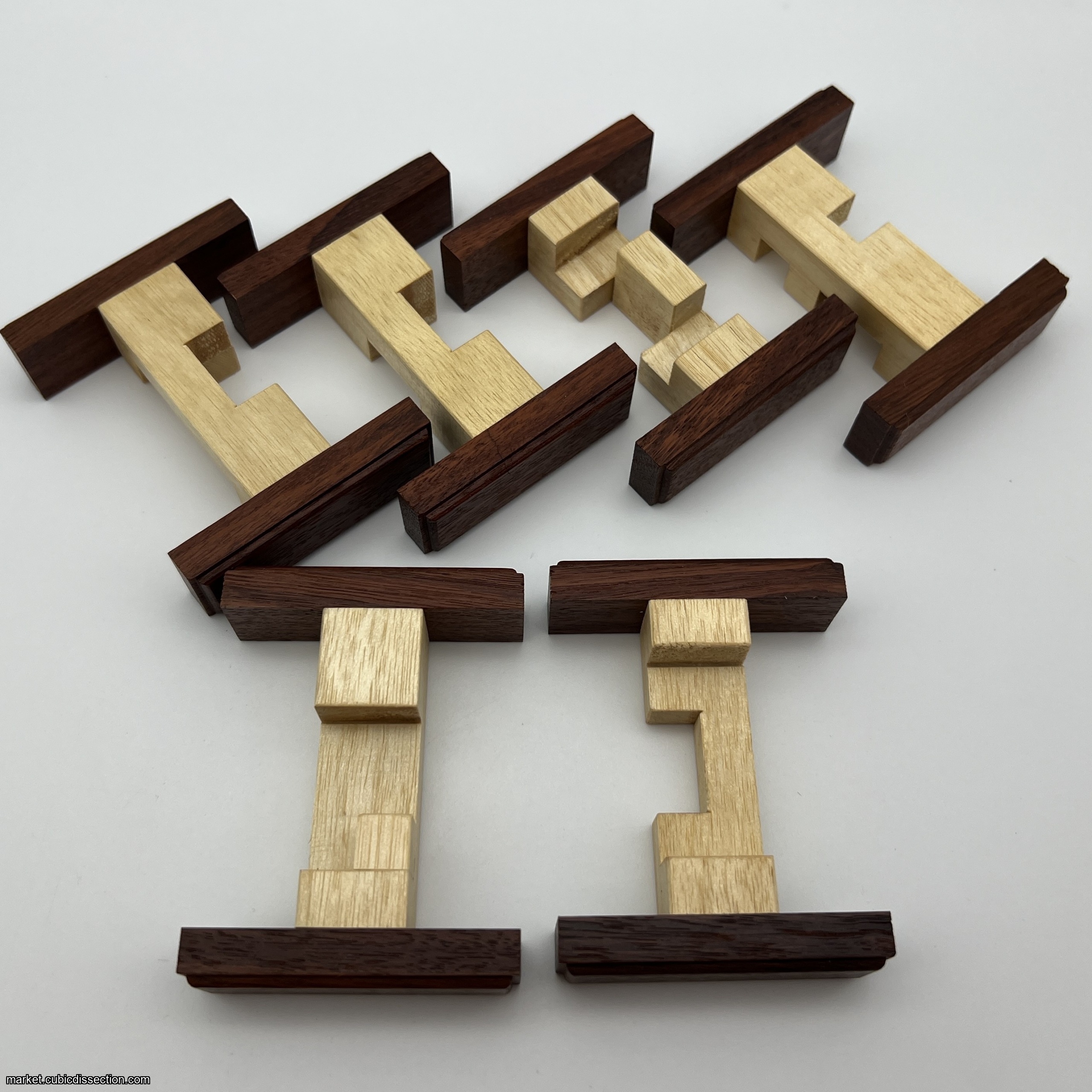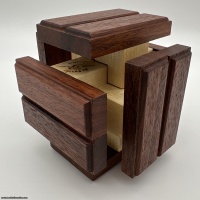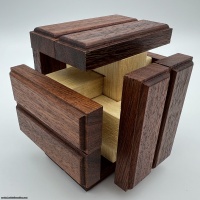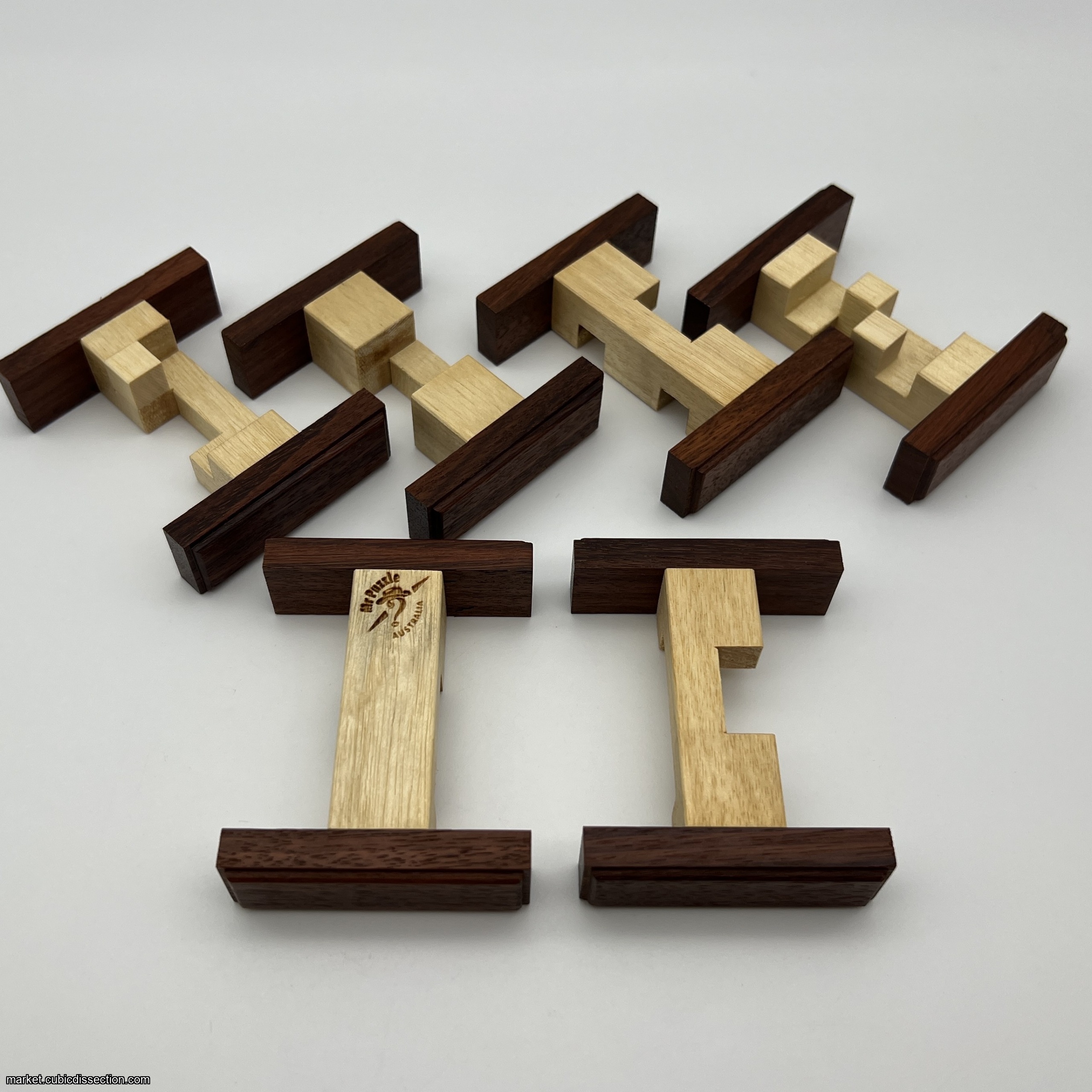 The puzzle is made from Queensland Silver Ash and the ends of each piece are from contrasting Western Australian Jarrah wood. The colour of the red wood varies from a lighter pink colour to a deep brown red.
