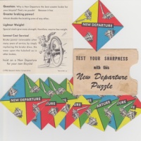 Standard 9-piece edge-matching puzzle is a 1952 premium for General Motors Corporation's "New Departure" coaster breaks for bicycles. Includes 9 colorful, illustrated cards (mint) and envelope, plus an illustrated folded instruction sheet that promotes the product on the back.