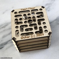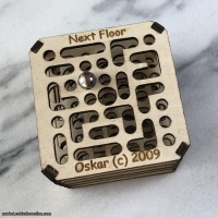 Next Floor is a multi-level, ball traversing maze.  From Oskar's website: "This is a multi-layer ball maze. Try to get the steel ball out of the maze. The ball interacts with both floors and ceiling, so it is quite a challenge to see the path. This makes it a fun puzzle."  Next Floor was an IPP29 exchange puzzle (2009).