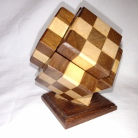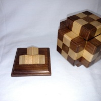 A three piece 3x3x3 "cross" burr. Includes stand.