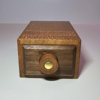 This is a sequential discovery puzzle box enspired by bare hand catfish fishing (noodling), and one of Eric's most challenging.  Solve the multi-layered locks and mechanisms to open the drawer and claim the, IMHO, coolest, cheeky-est, LOL prize I've ever seen in MY collecting.