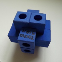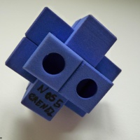 "With the invention of the NOS (New Old School) puzzle series, Gregory took the six piece burr format and turned it on its head. ... Gregory came up to me at IPP this summer and let me play with a couple 3D printed versions and I was hooked. These look like traditional six piece burrs but are nothing like them. The angled internal geometry allows for some outrageous movements. They are very confusing and wonderfully different. ... Crenel is the fifth of the NOS designs and is difficult to disassemble and assemble. It has extremely unusual movements that will have you muttering under your breath when you take it apart, and exclaming admiration for Gregory's genius when you reassemble. The peculiar back and forth gate movements are extraordinary."