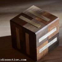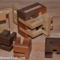 This is a six piece board burr encased in an eight piece cube. The cube pieces are made out of solid wood which gives this puzzle an overall weight that is pleasing and the boards are well made and strong.