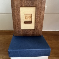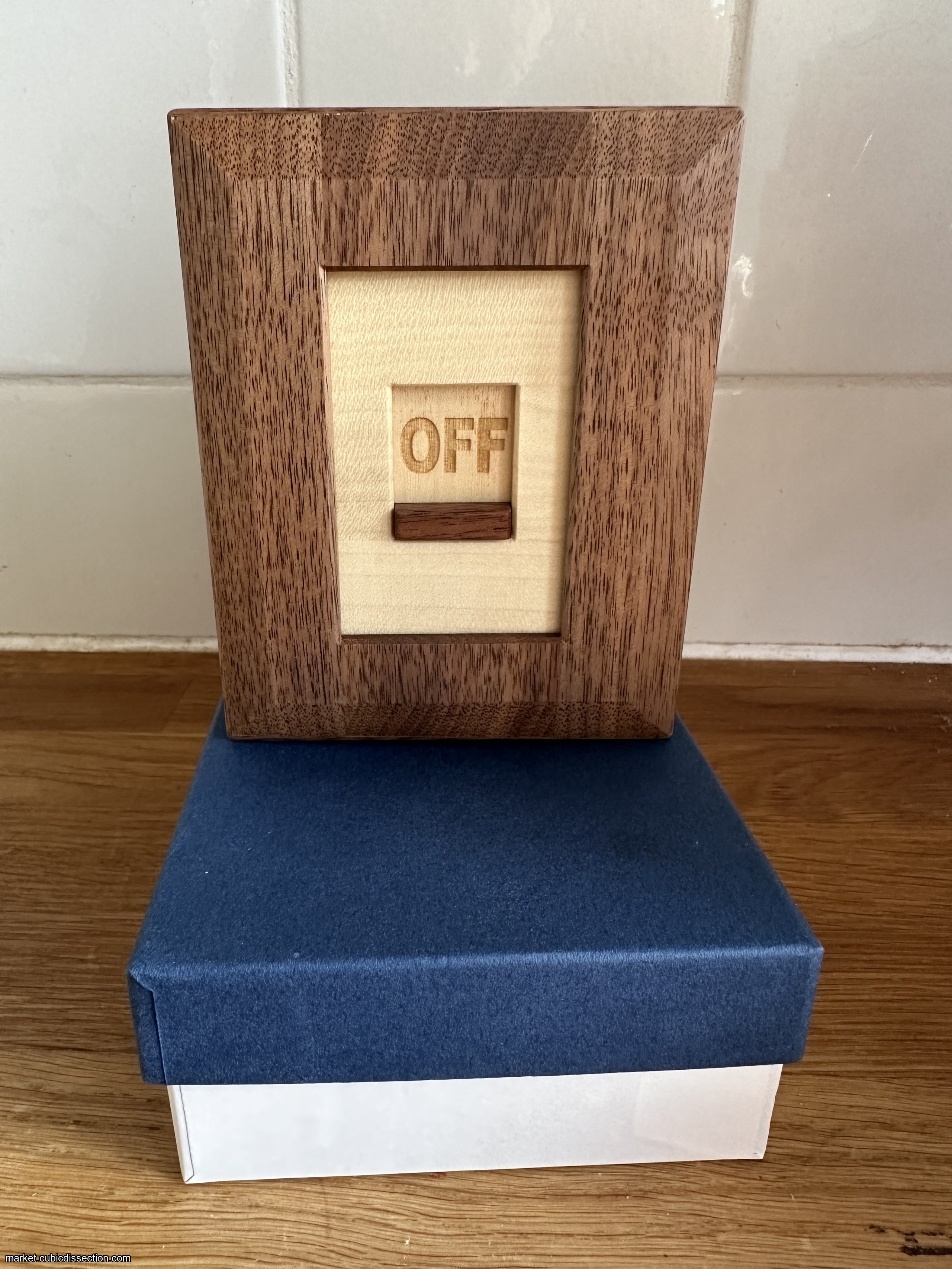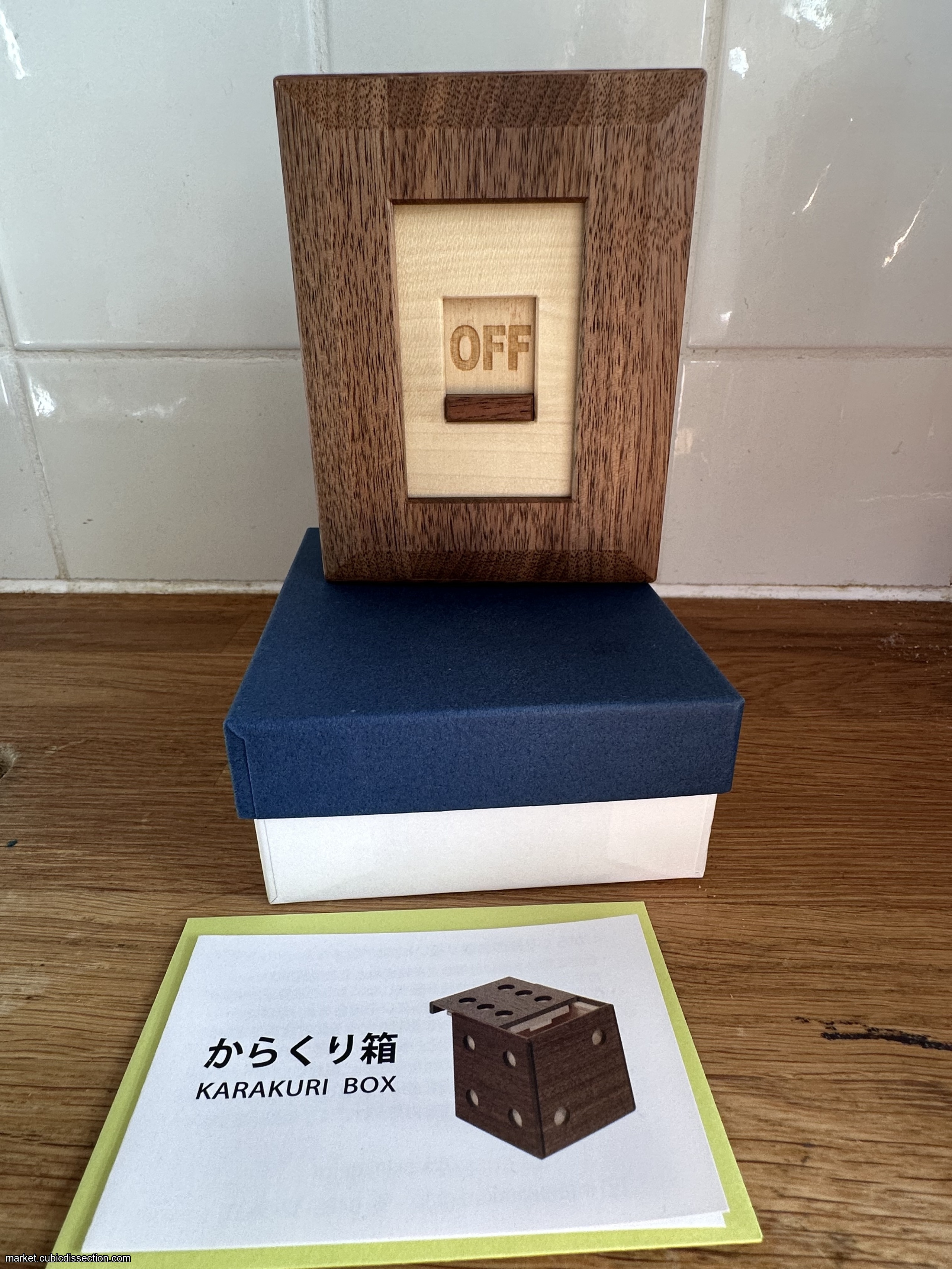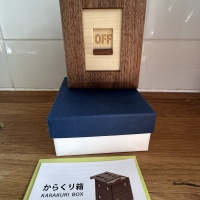 This is On! by Karakuri. It was part of the idea context in 2024. Orginal idea by Yasunari Makino and hand-crafted by Osamu Kasho. It is a very well made puzzle with a fun solution. You will love it!