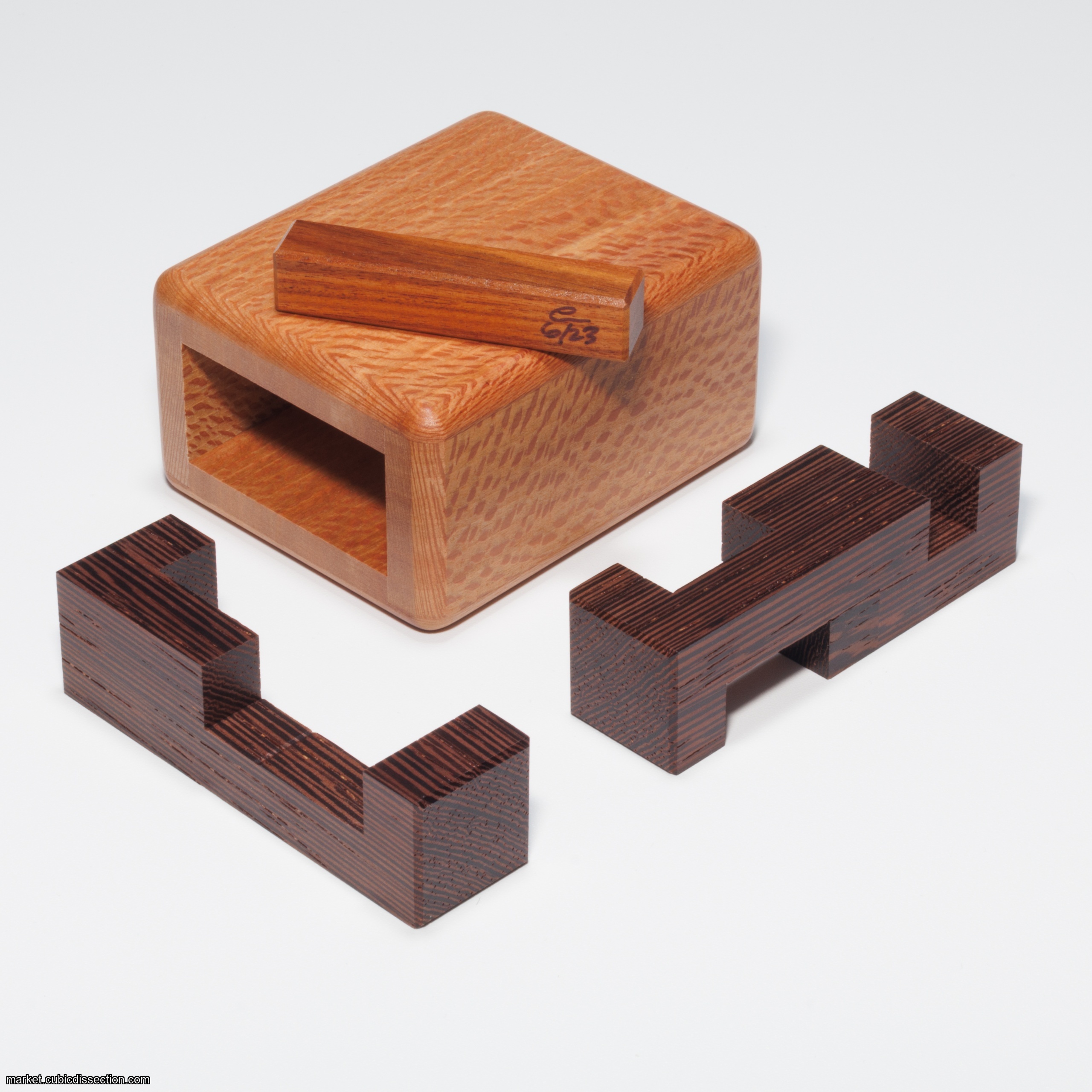 This puzzle was made with a Quartersawn Sycamore box and Wenge & Morado pieces which was different than the production versions. There will be 2 more copies available in future events.