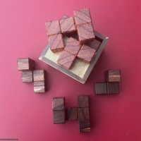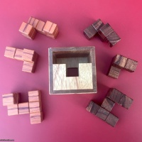 Another of Alex's packing puzzles is Opposite! Here, I am including two sets of pieces for the two versions of the puzzle. The primary objective is to fill all the openings with both versions. Opposite 1 has two possible solutions to get the pieces into the box but only 1 of them will fill the openings with moves of 9.4.5. Opposite 2 has a total of 5 solutions for getting the pieces in the box but again, only one that fills all the openings with moves of 9.3.6. Each set of three pieces is of a different wood. Woods for pieces are Mora and Madrone.