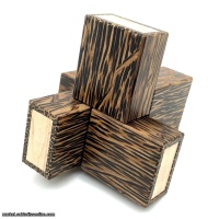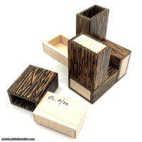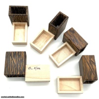 Matchboxes is quite time-consuming puzzle to craft. Each piece is constructed using the same robust shoulder joinery we used to make the Tube It In puzzle. The result is a puzzle that looks small and fragile but is really quite strong. Fit and finish are sublime; each piece has minimal movement once joined with another.
