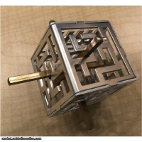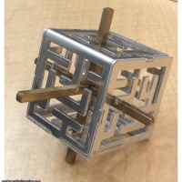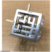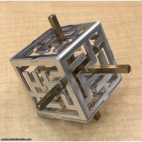 This metal puzzle is a 3-dimensional maze. From a previous CD Marketplace listing: "This is a metal discontinued item... As described by Oskar, it is a 3-dimensional mechanical maze which has a surprising number of possible configurations, with a minimum of 36 distinct slides required to move the star from one end of the maze to the other. Each side of the cube is marked with a *circle* and *square* to dignify the start and end positions."