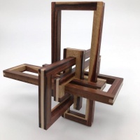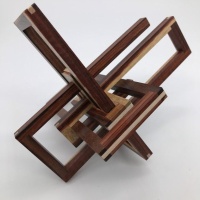 Another classic by Oskar van Deventer, the Paperclips puzzle is rarely made, and for good reason. The length of the sticks and small surface area for overlap at the edges makes it very difficult to construct. Each corner is reinforced by a shoulder joint, then sanded flush and further reinforced with a full length spline. This is a very time consuming process, but is the only way to ensure the strength and rigidity necessary for this work of art.