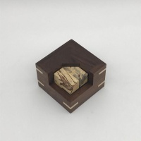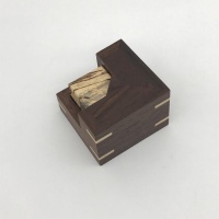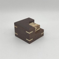 Construction of this puzzle is very very good, with a solid wood box and mitered slipfeathers which contrast nicely. Fit is excellent, precise yet with room for humid climate expansion. This puzzle is shipped disassembled.