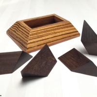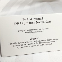 The Packed Pyramid puzzle was Norton's Starr's Exchange puzzle at IPP 35. Designed by beautifully crafted by Bill Sheckles the puzzle has 3 challenges. Build a pyramid with four Katalox (Mexican Ebony) pieces, build the pyramid in the Zebrawood box, and Pack the four pieces within the box.