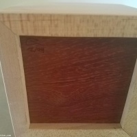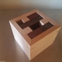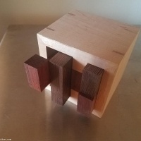 Precision crafted from fine domestic and exotic stock, the use of mitered joinery gives this puzzle the appeal of quality craftsmanship. The box is also mitered, with subtle slipfeathers of the same species displaying lightly contrasting endgrain against the face grain of the sides. The bottom of each box is floated to accept humidity movement, and is solid exotic wood (paduak, wenge or bocote).