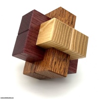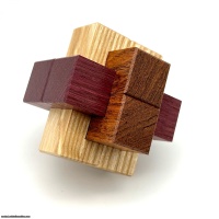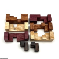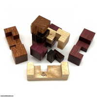 We are excited to work with another new designer Tyler Hudson for this release. Parasitic Burr is an eight-piece burr in the disguise of a traditional six-piece burr shape, done in an ingeniously simple way. Six standard burr pieces interlock around two identical tetracube pieces which are hidden inside the belly of the final assembly. The unique solution is an approachable level 3, and figuring out the correct placement of the smaller inside pieces makes it a very fun assembly puzzle. Look out for more of Tyler's burr designs in upcoming months.