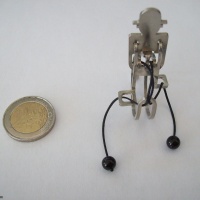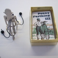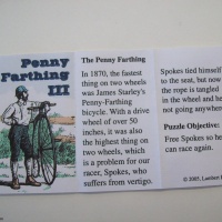 In 1870, the fastest thing on two wheels was James Starley’s Penny-Farthing bicycle. With a drive wheel of over 50 inches, it was also the highest thing on two wheels, which is a problem for our racer, Spokes, who suffers from vertigo. Spokes tied himself to the seat, but now the rope is tangled in the wheel and he’s not going anywhere.