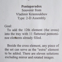 Different from the classic pentominoes which consist of squares, the elements of this puzzle constitute rectangles with ratio of 13/18. The chosen compression ratio enables the paradoxal quality of the puzzle: at first sight, the start position does not have enough room for adding the 12th piece.
