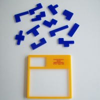 The puzzle conststs of a rectangular frame and a 12-piece set of flattened pentominoes.