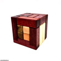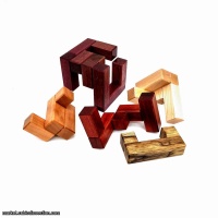 Five is the magic number! This "Turning Interlocking Cube" has a level five solution, with five rotations and five different wood types. Designed by Andrew Crowell, these fascinating TIC's take it to the next level. Instead of straightforward linear moves, these designs require rotations during the solution process. Construction is outstanding, with shouldered joinery where side grain gluing is not possible, and detailed bevels which flow around the shouldered joints for a uniform appearance.