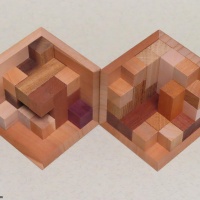 The goal of this puzzle is to pack and unpack the eleven (flat) pentacubes into the 4x4x4 cube casing.