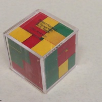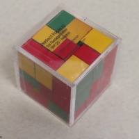 The goal of this puzzle is to pack all 28 equal blocks (measuring 3x4x5 each) into a 12x12x12 cube.