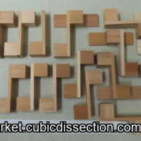 Assemble a cube out of the 14 pieces, made of one or more voxel-cubes and one or more planks each.