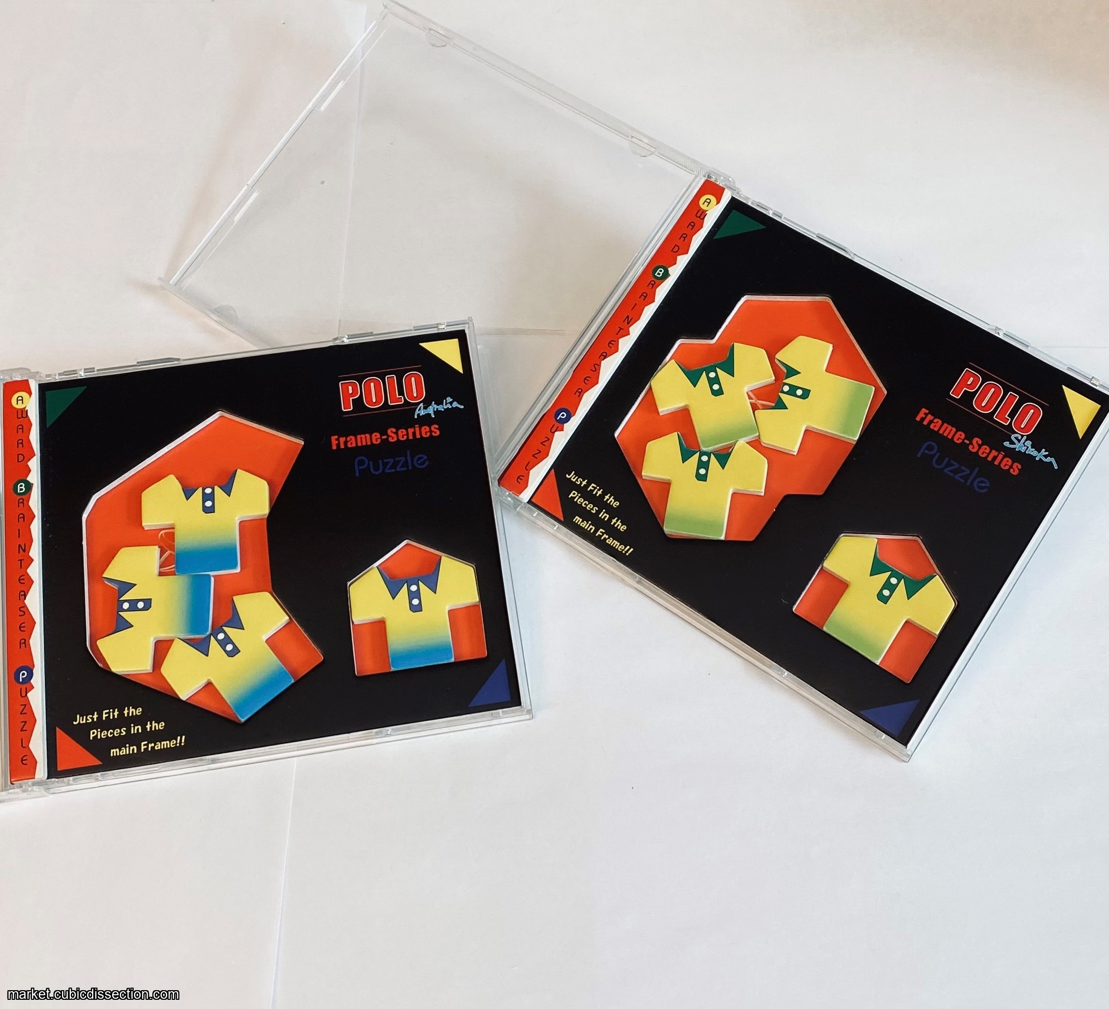 The original Polo-Shirt Case puzzle is a packing puzzle with two challenges using the same pieces: the goal is to pack the "shirt" pieces into the space on each side of the tray.  It won the Grand Prize at the 2002 Design Competition.  This remake from Chronos provides both puzzles separately, each in a CD jewel case.  A really fun design.