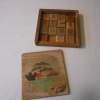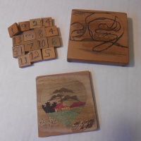 A wooden 15 puzzle. This has been heavily abused and gouged by some idiot with a pencil, wood-burned, and partly sanded. Worst condition of any puzzle I've ever seen. On the other hand, it's also a fairly unique "15" puzzle with Japanese marquetry. And it's all there. You can have this poor, beat-up puzzle for a buck, if you need to temporarily fill a hole in your collection. I'm not sure where I got this from. This will be mailed in a bubble-mailer, with packaging that's 2 oz. I will not ship outside the US on this item (the postage would be prohibitive), unless the winner bought something else along with it.