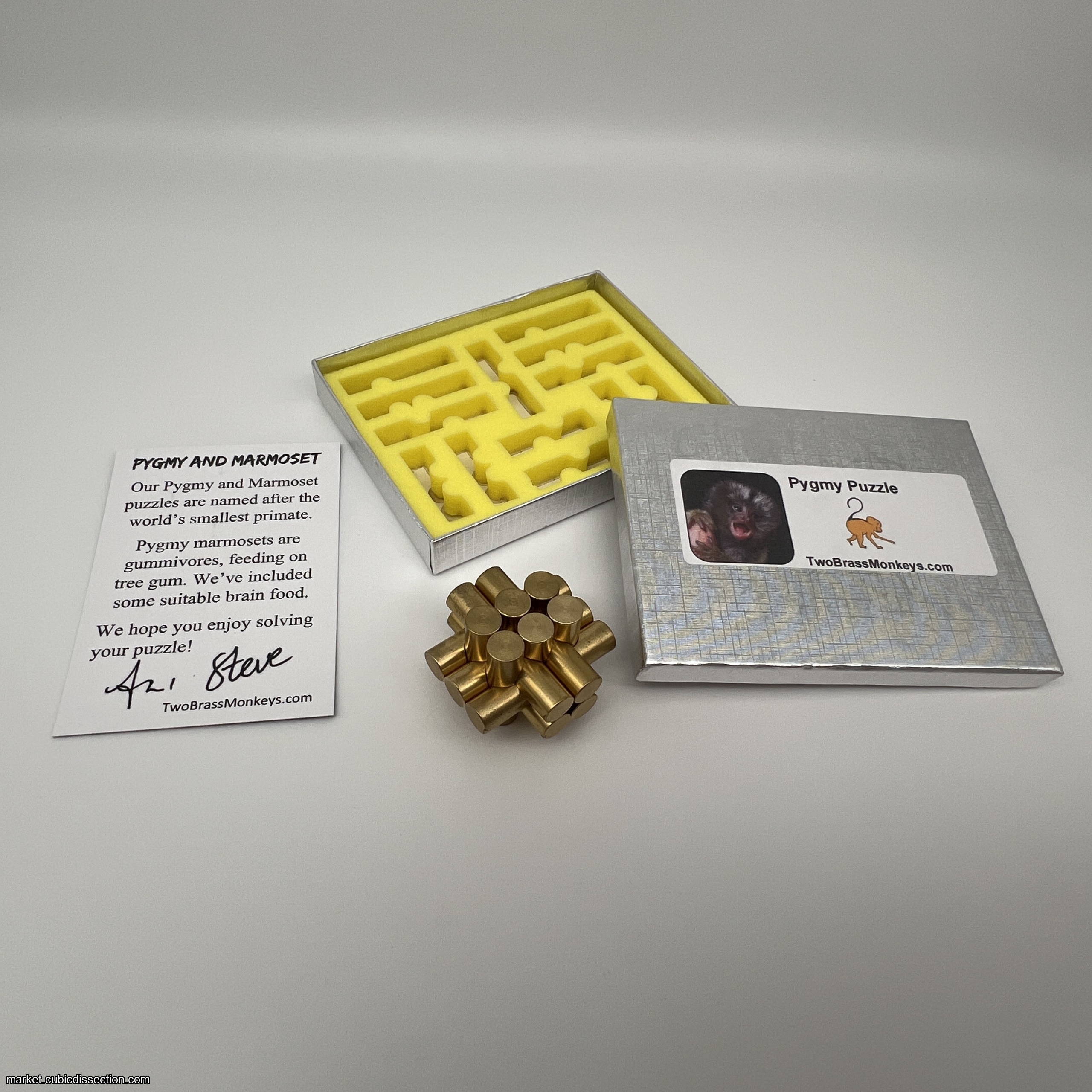Pygmy and Marmoset are the latest Interlocking Burr creations by Ali Morris and Steve Nicholls (collectively known as Two Brass Monkeys). Steve and Ali hide their creative genius behind trickster personas; their product's quality is often belied by a lighthearted presentation. Don't be fooled...candy and primate pictures notwithstanding, their puzzles rank among the best in the world.