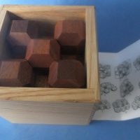 Pyracube introduces a large family of puzzles made by joining polyhedral blocks together different ways, in this case by using edge beveled cubes (or to put it another way, truncated rhombic dodecahedrons). Strange as it may seem, they pack snugly and neatly into the cubic box with or without the single block. They will also form these seven other symmetric assemblies.