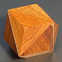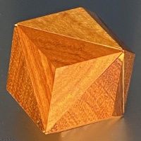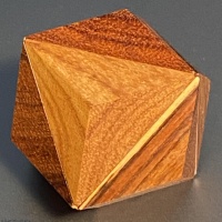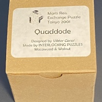 Designed by prolific puzzle designer Victor Genel and beautifully manufactured by the famous and popular puzzle craftsman Wayne Daniel, Quaddode was used by perennial Puzzle Exchange participant Marti Reis at the 21st International Puzzle Party (IPP21) held in Tokyo in 2001.  The goal of the puzzle is to assemble four identical wooden pieces into a rhombic dodecahedral figure.  As is the case with all Wayne Daniel creations, the puzzle is beautifully manufactured and finished in wood.  The first three photos show the puzzle as viewed from different angles.