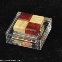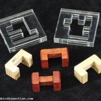 | COMMENTS: | I noticed a lot of interesting board and stick burrs coming out on Ishino's site so I decided to make batch of them. After looking at a couple dozen designs I chose six for their rpresentation of the various concepts and levels of difficulty. Believe it or not, this is the simpler iteration of the Quads and Rings series. Four wooden burr pieces interlock with two acrylic pieces with a level 13.5 solution. Doable dispite the high level because a lot of the moves just follow. Achieving the checkerboard pattern is a second challenge. Construction is excellent, with close tolerances but plenty of room to maneuver. 38 copies made for sale; each signed and dated. Ships unassembled. |