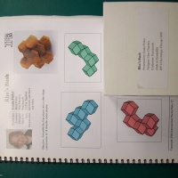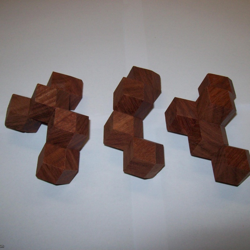 Assemble the three pieces into a cube-shape construction of 14 rhombic dodecahedra.