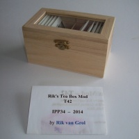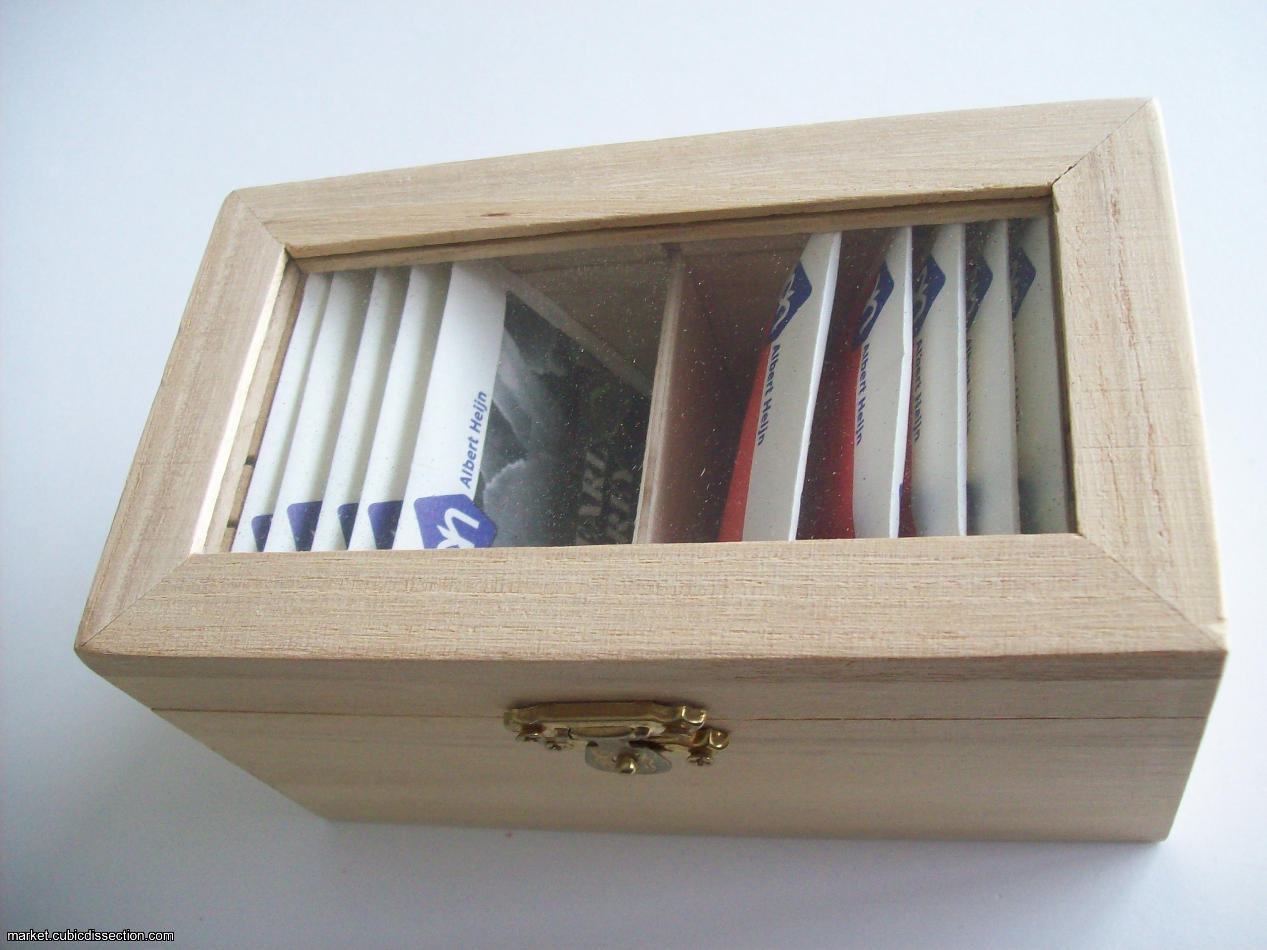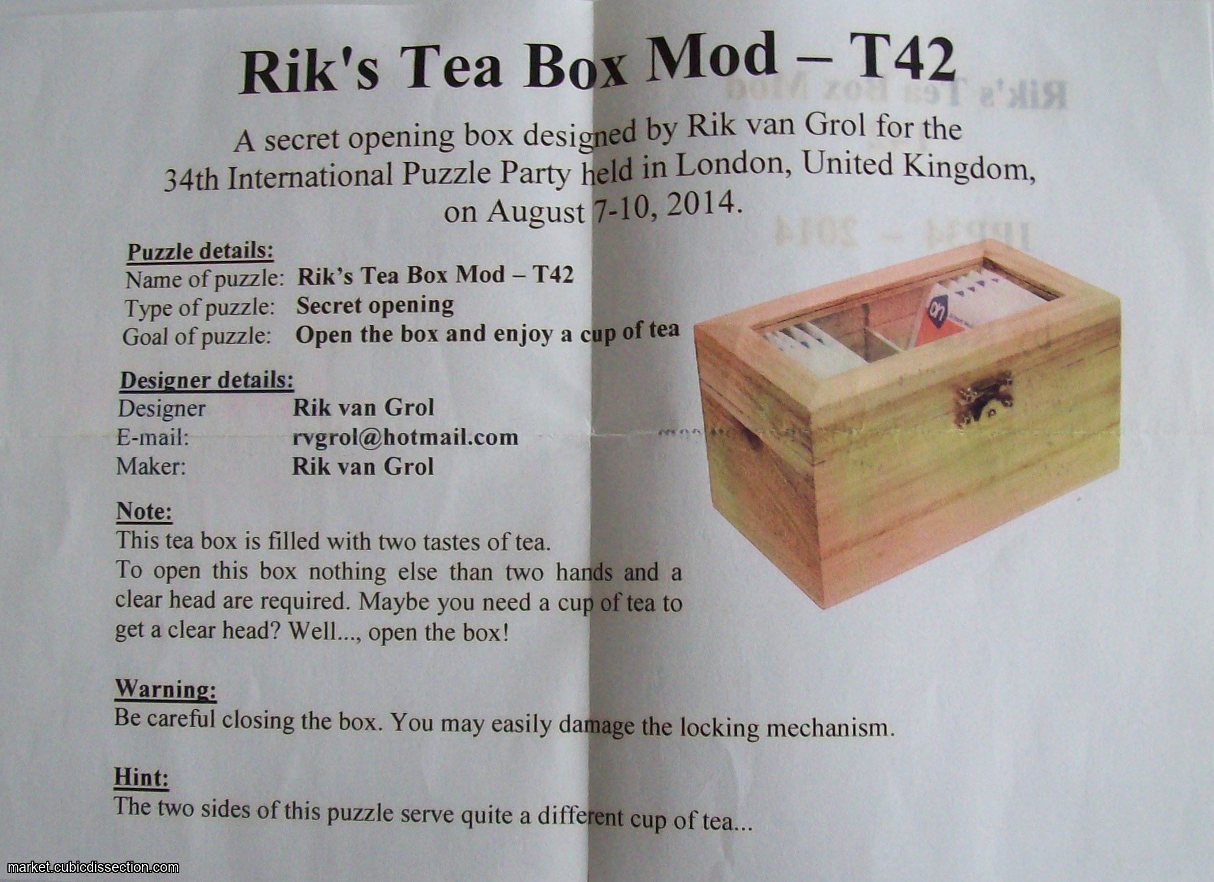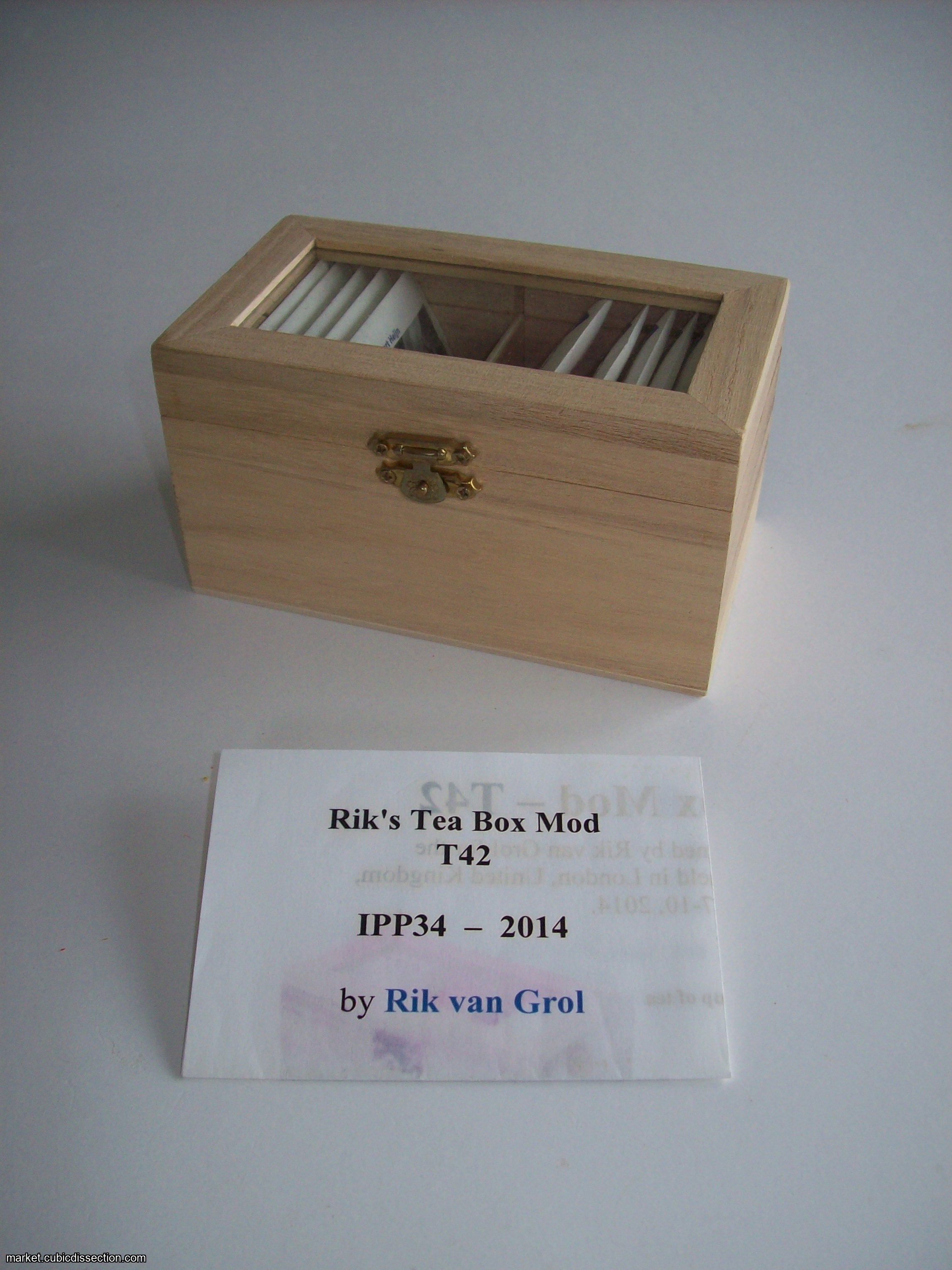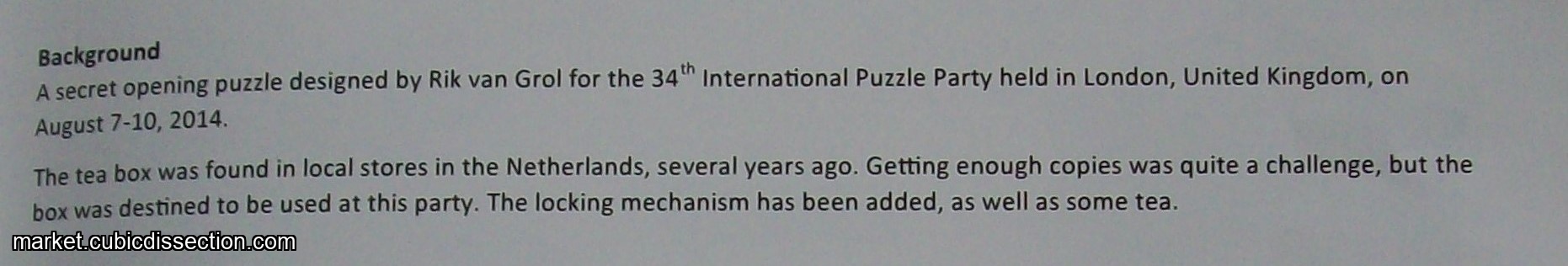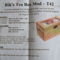 The tea box was found in local stores in the Netherlands, several years ago. Getting enough copies was quite a challenge, but the box was destined to be used at this party. The locking mechanism has been added, as well as some tea.