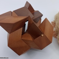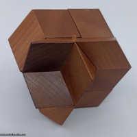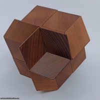 A classic coffin design. Six pieces assemble in a co-ordinate motion and the puzzle opens and closes like a rosebud. It can be assembled in other configurations. The movement on this copy is good though a little tight to begin with when the pieces have greatest contact with each other. It comes complete with the re-moveable retaining pin which allows it to be almost fully opened without collapse. I am not 100% certain but believe this to be a Wenge/Mahogany version made by Pelikan in 2005.