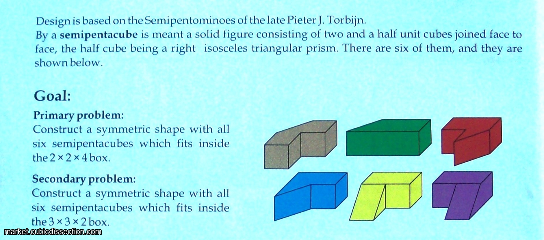 By a semipentacube is meant a solid figure consisting of two and a half unit cubes joined face to face, the half cube being a right isosceles triangular prism. There are six of them, and they are shown in a picture.