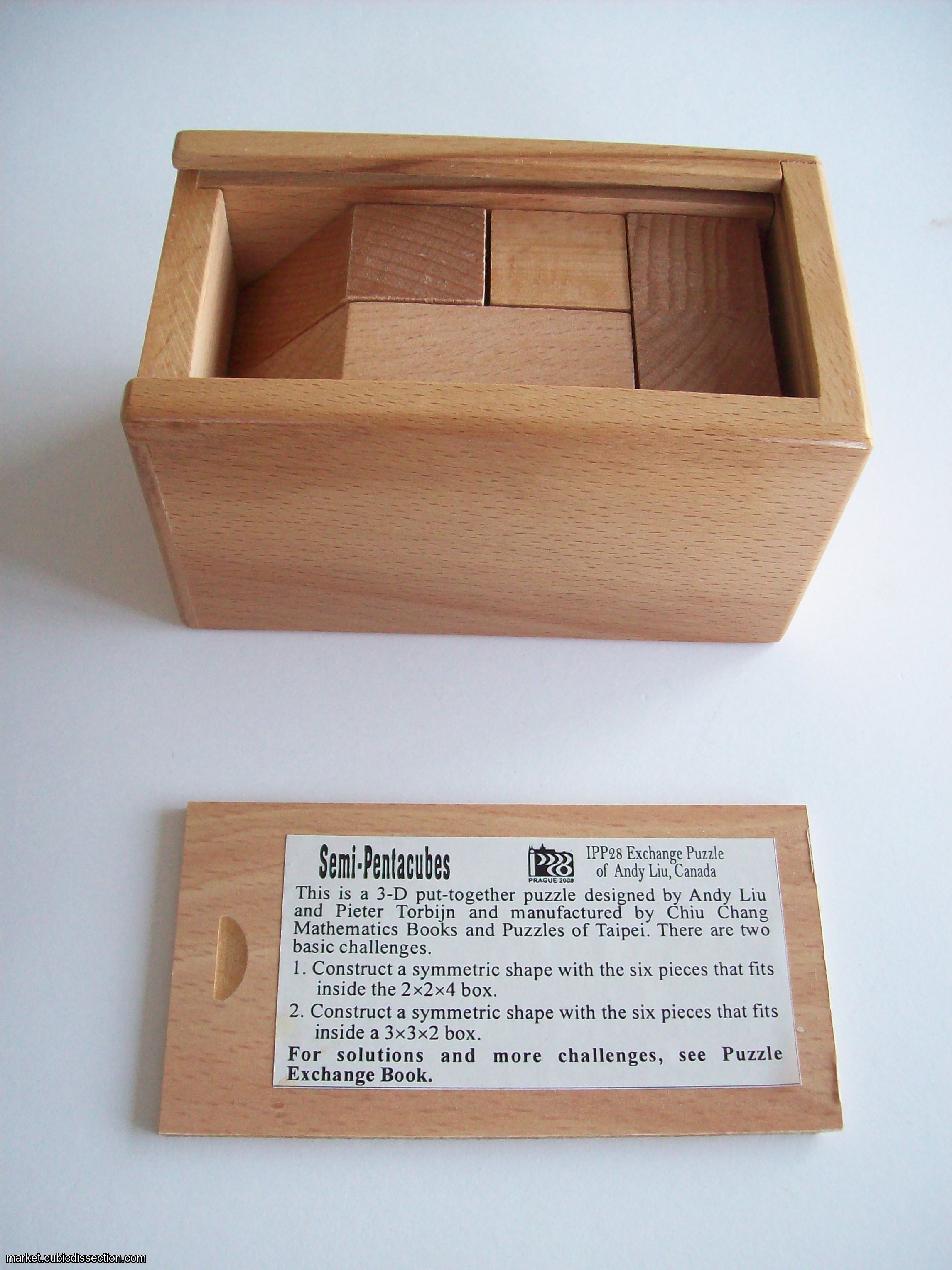Construct a symmetric shape with all six semipentacubes which fits inside the 2x2x4 box.