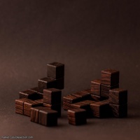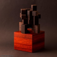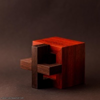 “Another stunning creation by the incredibly prolific Lucie Pauwels. She always produces designs that are interesting to look at either as pieces or as an assembled puzzle. This has been made by Pelikan in Wenge with a Padauk box and is simply stunning in the depth of colour. Of course the woodwork is superb. There are 4 different snakes along with 2 smaller pieces (?eggs or ?food) to be placed inside the caged box. The entry is very limited and forming the 3x3x3 cube through such a small set of holes is a big challenge. This took me quite some time as my intuition for where to place the small pieces turned out to be wrong. The solution level is not terribly high but it is a significant challenge worthy of any decent puzzler. It also will look gorgeous on display.”