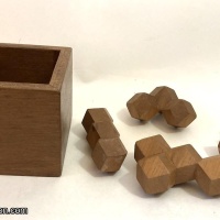 The four pieces of Setting Hen, each made of rhombic dodecahedron blocks joined together different ways, fit flush into a cubic box. The idea behind the name was that the pieces can be packed in such a way as to suggest Mother Hen sitting on her next of eggs with just her head poking out above the rim, assembled as shown in the graphic. The task then is for her to duck down flush with the top of the box.