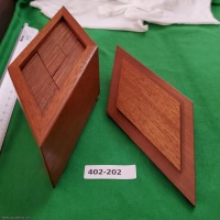 9 pieces, all cut at shear angles similar to box. The object is to pack the pieces into the box and close the lid.  The box is numbered "1120" on the bottom. Pieces made from masseranduba; box made from mahogany with walnut top and lining.