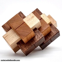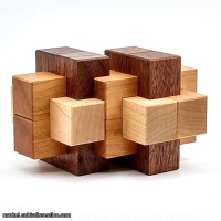 Siamese Burrs II is a delightful mashup of two traditional burrs. The level 12.4 solution has dead ends and subtlty. Were it made from a single wood, this would be an astonishingly difficult puzzle. As is, the wood choice gives the solver a fighting chance to realize this assembly...but only just! In the spirit of the NOS burrs, this is a very unique and unconventional puzzle that deserves a place on any collectors shelf. Construction of this puzzle is excellent. Fit is precise. This puzzle is shipped assembled.