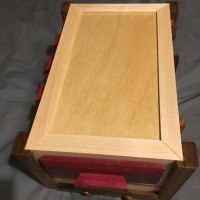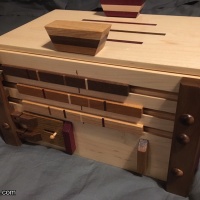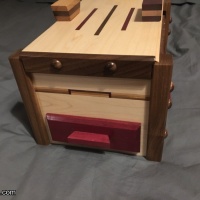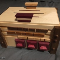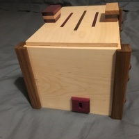 The Side Swiper puzzle box is a sequential discovery box with approximately 18 moves. (Kind of depends on what you consider a full move) There are various tools you will find along the way to help you out. It has 7 total compartments. The woods used are Maple, Walnut, Cherry, Oak, Purpleheart, Alder, Poplar and Padauk. Approximate dimensions are 10.5 X 7.5 X 6.5 inches.