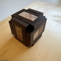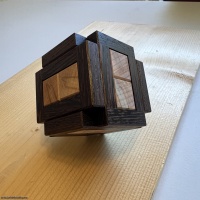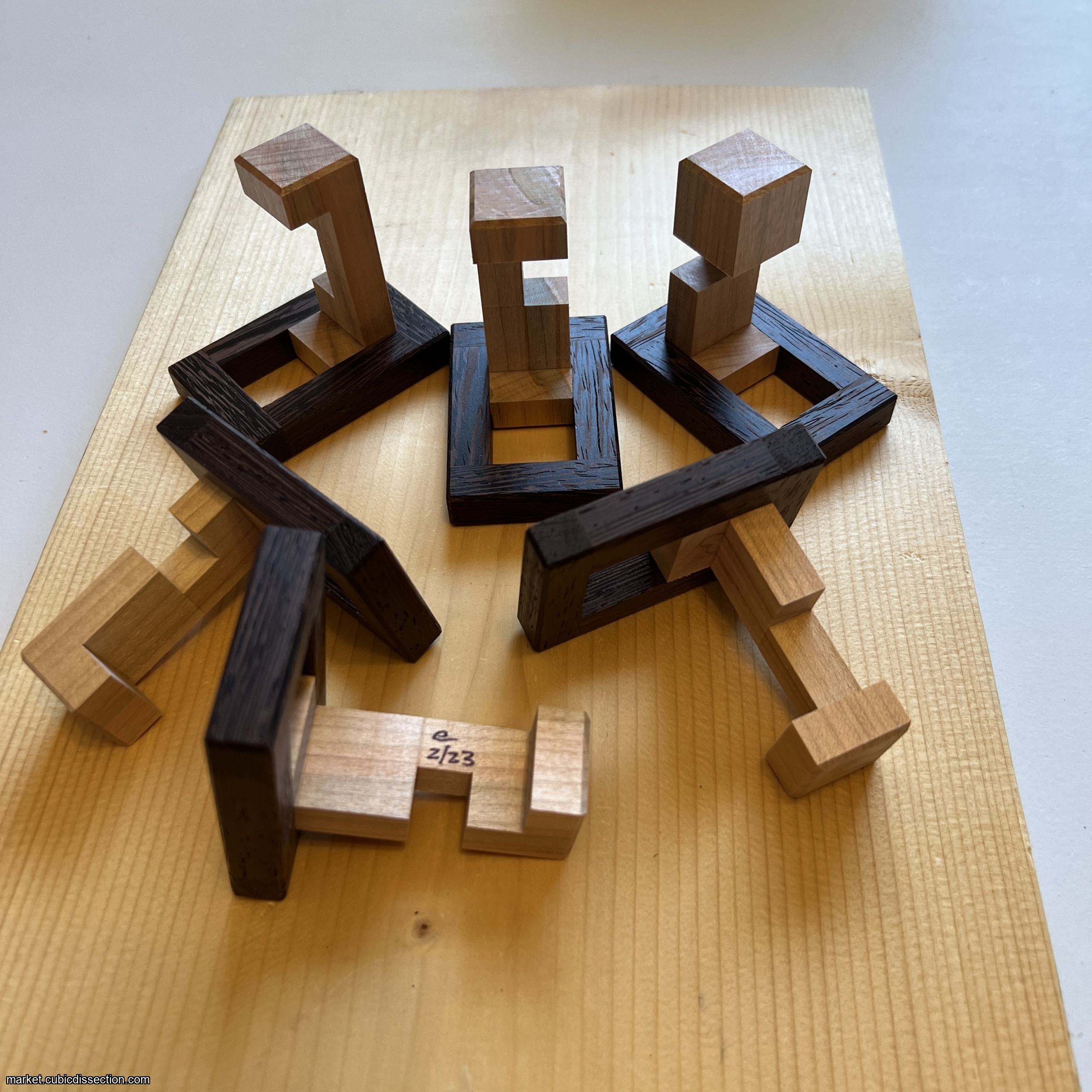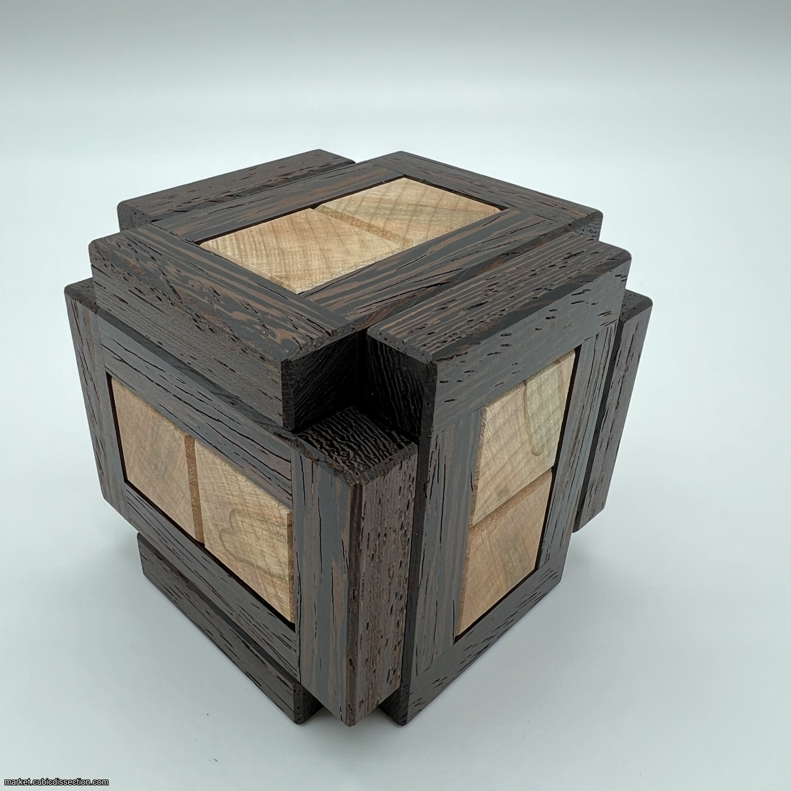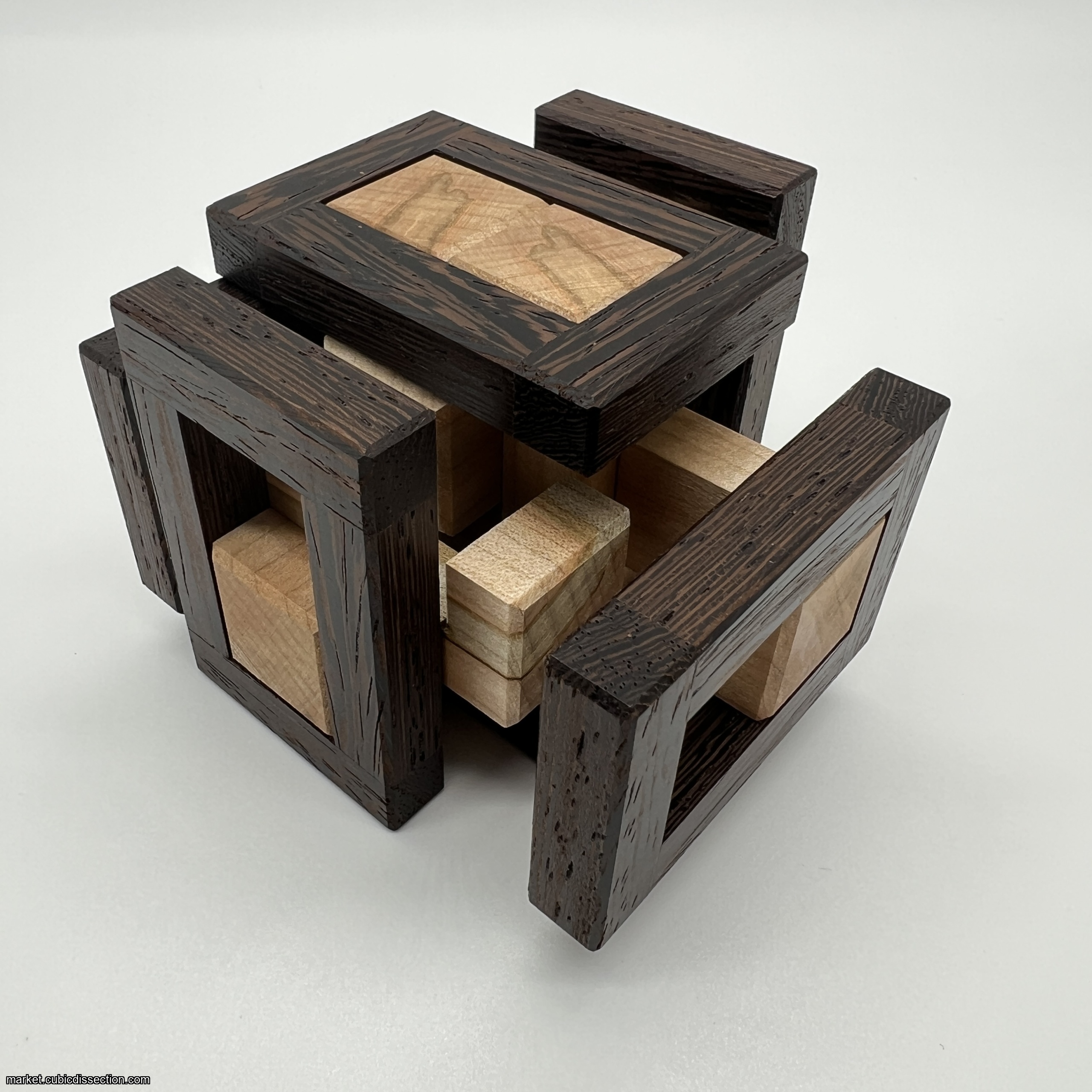 Six Doors by Yavuz Demirhan is a variation on the classic six-piece burr shape. The added rings around the endgrain resemble a stile and rail door once the puzzle is assembled. Each ring complicates the movement of the pieces to reach a formidable but approachable level 14 solution.