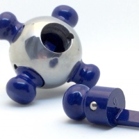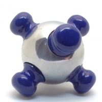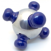 The Six Key Mine Puzzle was designed by R.D. Rose and won him a First Place award in the 2003 Nob Yoshigahara Puzzle Design Competition. This version was made by Bits and Pieces and is no longer being manufactured. The puzzle measures 3” across and is quite hefty in the hand. The goal of inserting the six pegs into the sphered centre will have you puzzling for some time. I do not have the solution sheet for this puzzle, but will supply a printed copy of the one that is on the IPP competition website.