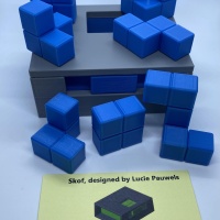 Skof by Lucie Pauwels and printed by Bruno. It is a restricted 3d packing puzzle and the box that the pieces go into slides back and forth.