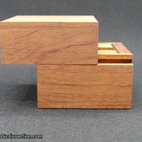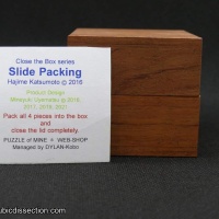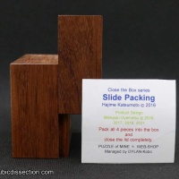 "The Slide Packing puzzle was designed by Hajime Katsumoto and produced by Mineyuki Uyematsu and I think has been made from Redheart and Yellow heart woods. It is a "simple" packing puzzle but was so clever that it won the Puzzler's award in the design competition. How could I possibly decline the opportunity to own and solve such a brilliant challenge. The cleverness in the design is that the 4 pieces consist of 3 C shapes and a single crooked S shape. They are to be fitted into a 3x3x3 space within the box - the twist in the tale is that the lid of the box slides in place and would be blocked by anything more than 2 units high. There are several ways to make the pieces fit into a 3x3x3 cube but not starting with a shape that is only 2 units high!"