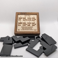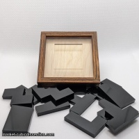 "Eight challenges in one puzzle! This should keep you busy for a while. I really enjoyed building and playing with these. I have not yet solved all 8 versions. Slide Swipe is a series of 8 tray packing puzzles, each using the same 5x5 tray with a 3x3 opening on top and various subsets of 12 2D pieces. On the Lacewood version, the pieces can be stored in the bottom of the tray. Both puzzles have 1/4" black acrylic pieces."