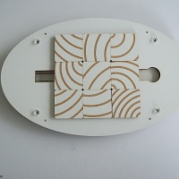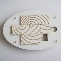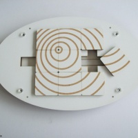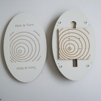 This is a sliding puzzle with 9 sliding pieces. In the middle there is a sliding element with 3 pieces that move at the same time to the left or the right. On one of the sides is it possibility that 1 piece can rotate 360 degrees around the axis.