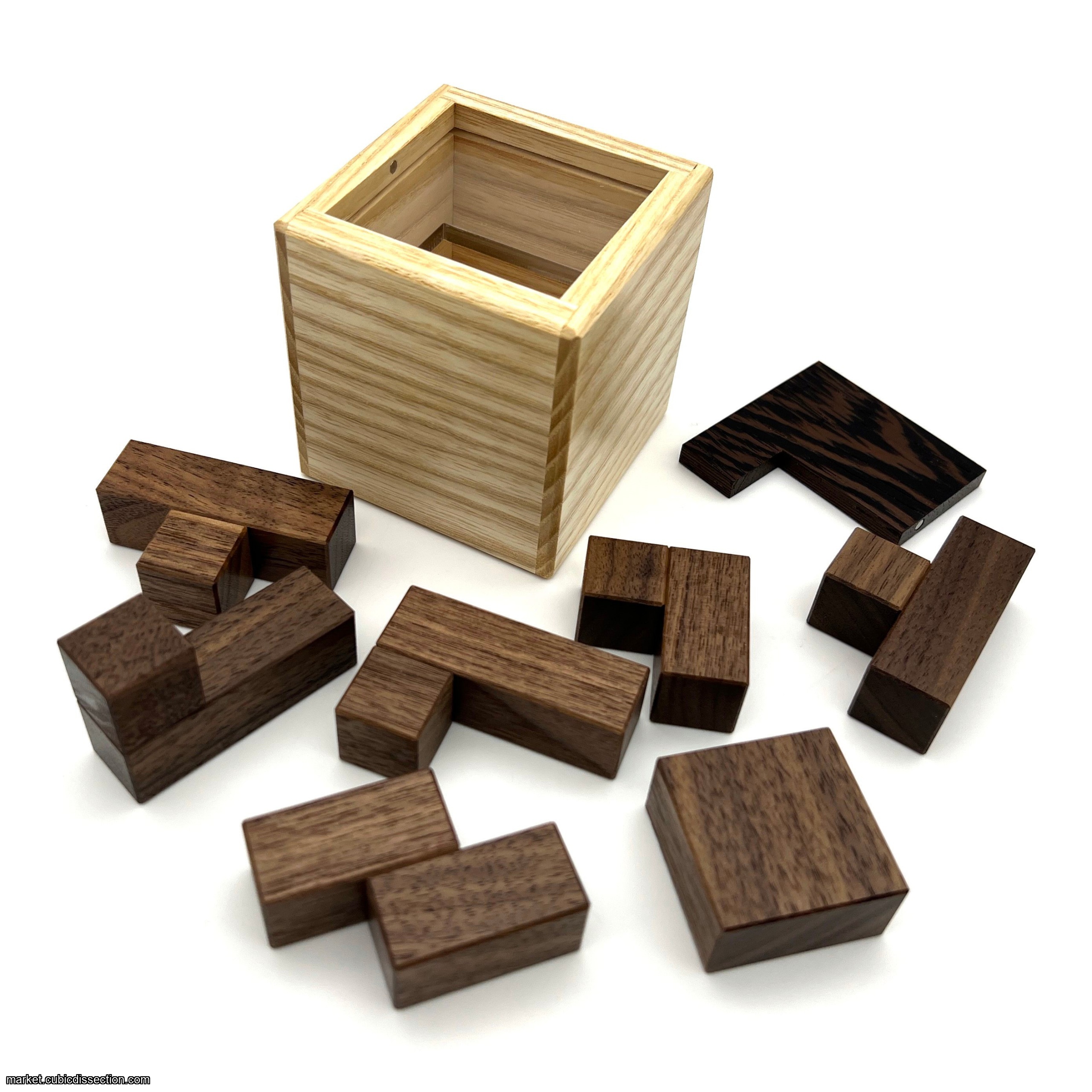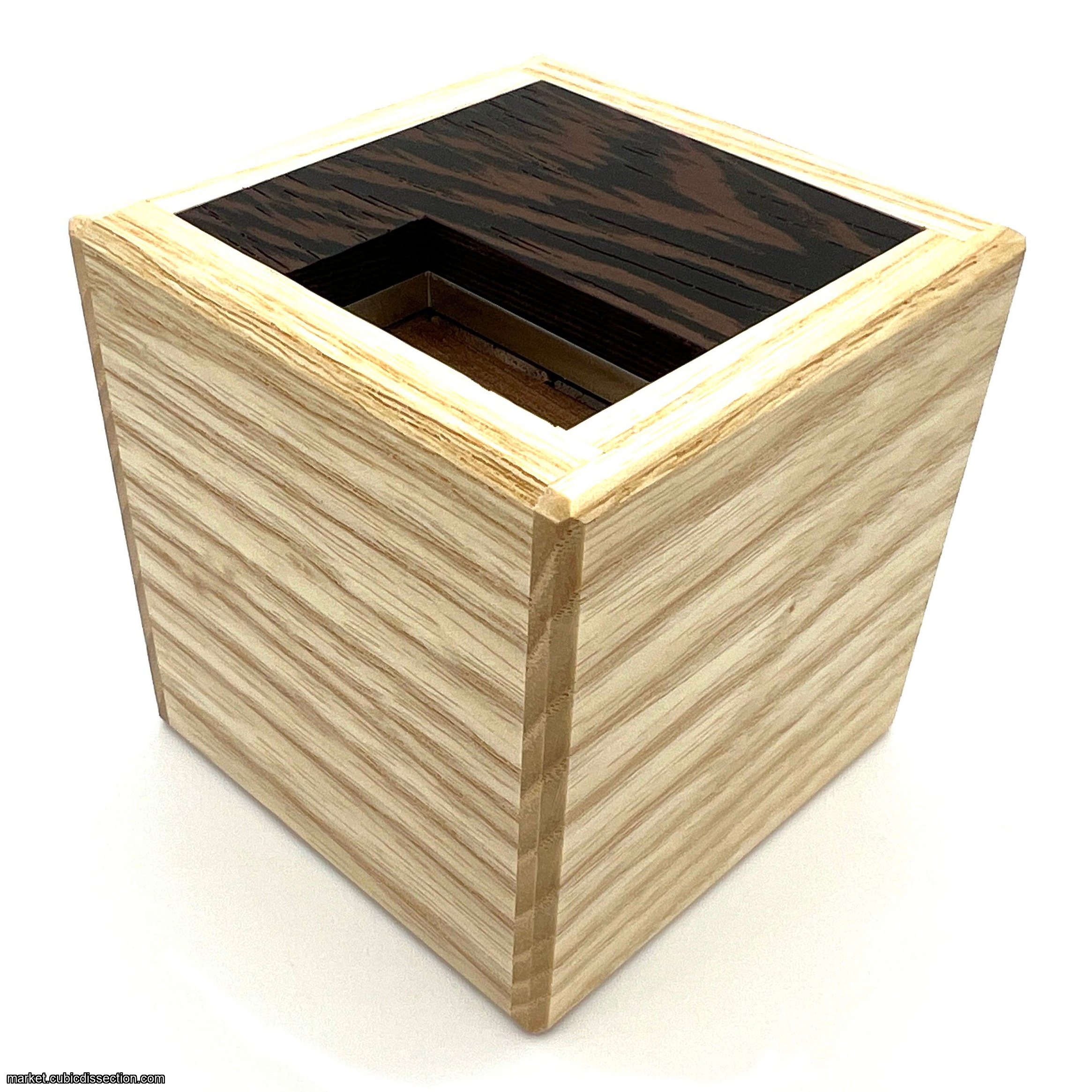 Construction features a shouldered Ash box and individually beveled pieces made from American Black Walnut, and a Wenge top panel. Slot Machine (2023) ships in an unsolved configuration.