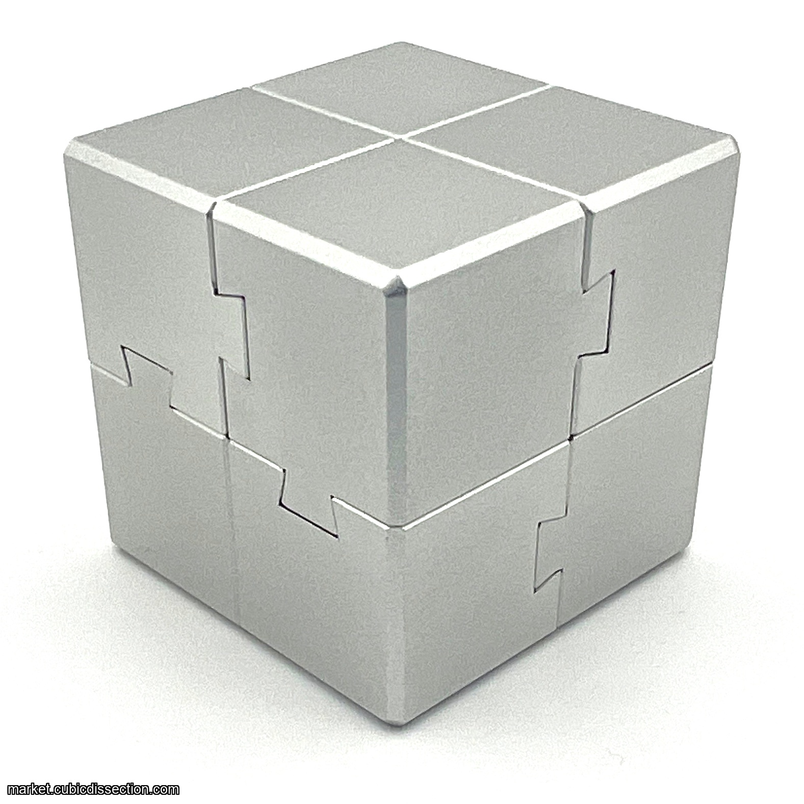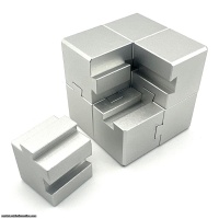 "This puzzle was inspired by the 3x3x3 dovetailed cube that Wayne produced a few years ago. With permission and a little advice I decided to look into reproducing the design. I quickly realized how many possibilities existed in the 3x3 format, and decided to start with a 2x2. I brought Ronald in because his burrtools kung fu is far superior to mine...lucky for me he was in a design slump, so he picked up my gauntlet and ran with it. The result is this optimized level three beauty. The four pairs of identical pieces come together in a somewhat unexpected way. While not terribly difficult, it's a fun puzzle to solve and manipulate, and it displays very well."