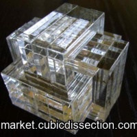 This puzzle was designed by Dic Sonneveld of The Netherlands. It is made of clear acrylic . It used to be sold mounted on a circular stand. I am now selling it without the stand for half the price. It seems as though it would be impossible to make a board burr using 9 pieces, but Dic persisted, using a computer to test a combination of three very simple triplets. There is plenty of room inside each piece leaving enough space for the 9 pieces to come together into a burr. One would think that there would be many solutions. No, there's just one. One would think that the solution would be symmetrical. No, its asymmetrical. It is one of a kind, quite unique and fun to play with.