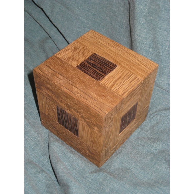 This is an amazing 3-piece caged burr that defies all attempts to solve it, until one realizes one must break all the rules (but not the puzzle) by using unconventional moves... Extremely difficult and amazing put together. How Mr Sonneveld came up with this, I have no idea...